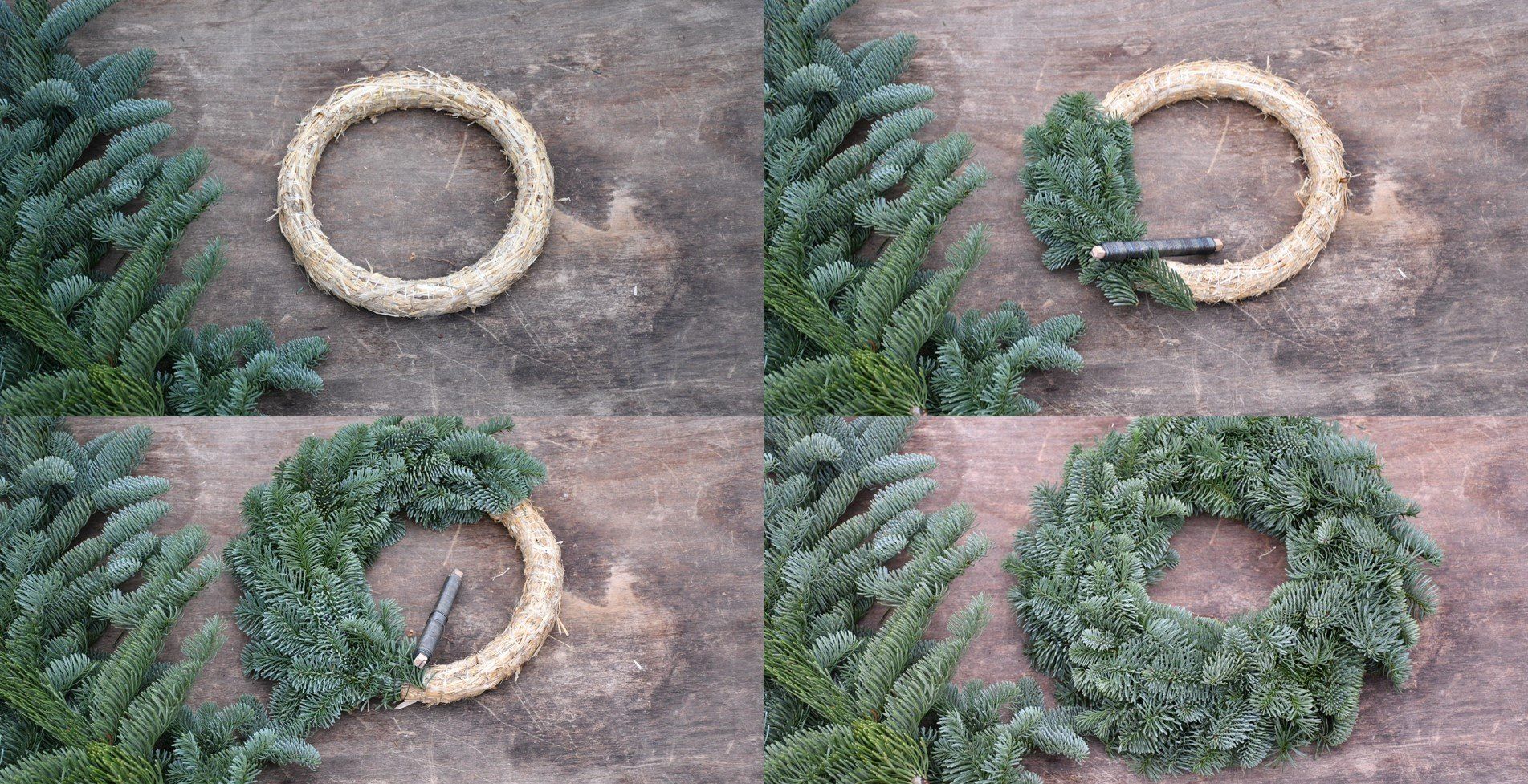 Die Drähte durch den Kranz stechen (dabei ruhig etwas beherzter zustechen - im Idealfall gelingt es beim ersten Versuch!), darunter umklappen und im Römer festpinnen. Sicherstellen, dass alle Drähte fest im Strohrömer verankert sind! Der Kranz sollte sich an den Kerzen anheben lassen. So ist ein sicherer Stand gewährleistet.